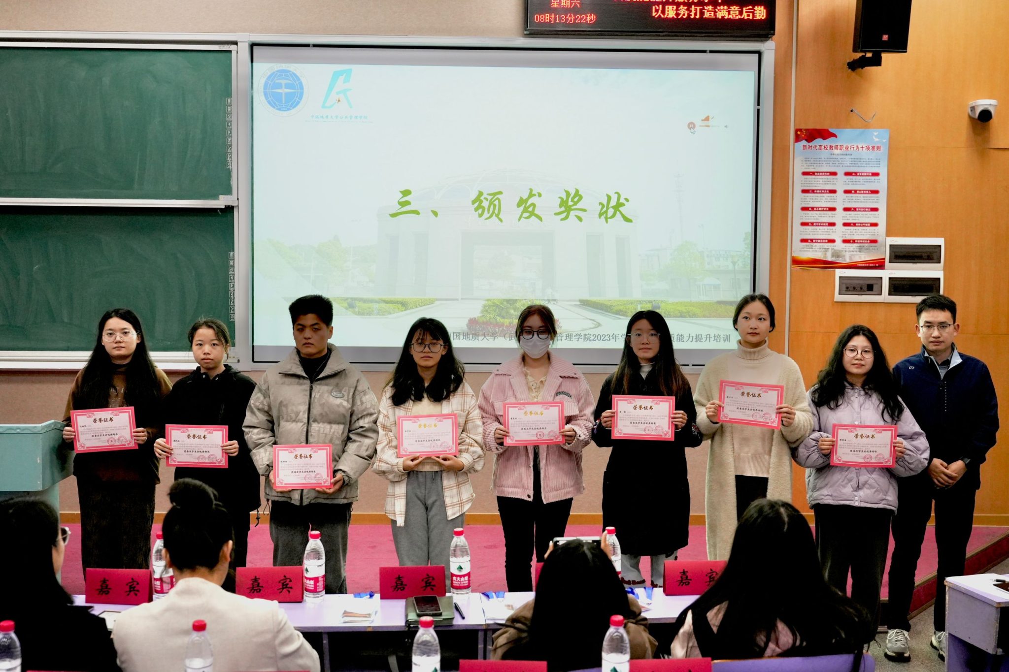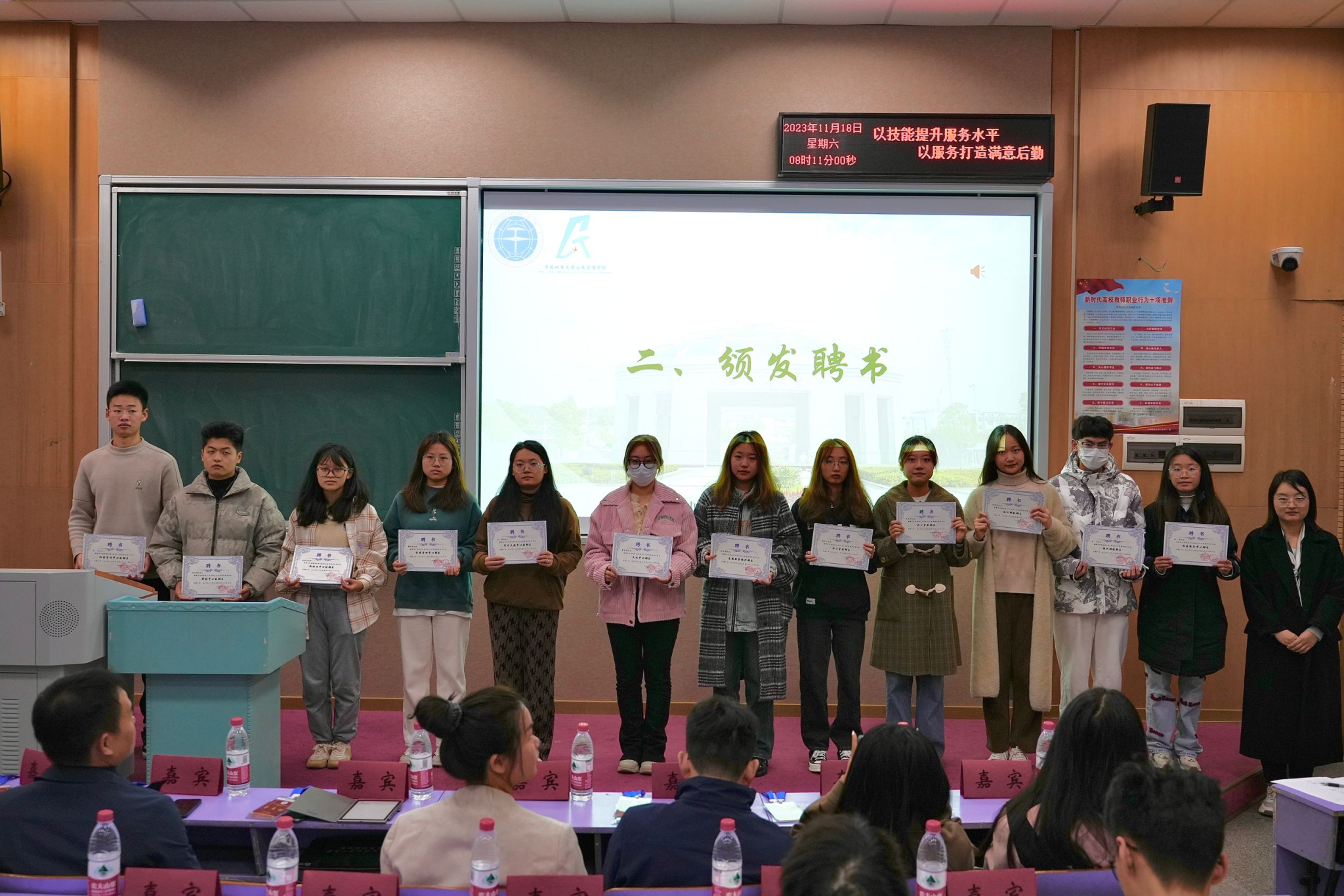 在庄严的国歌齐唱声中,开班典礼拉开帷幕。与会教师为团学骨干们颁发2022-2023学年团委学生会部长聘书及第二学期优秀部长、优秀部员奖状。