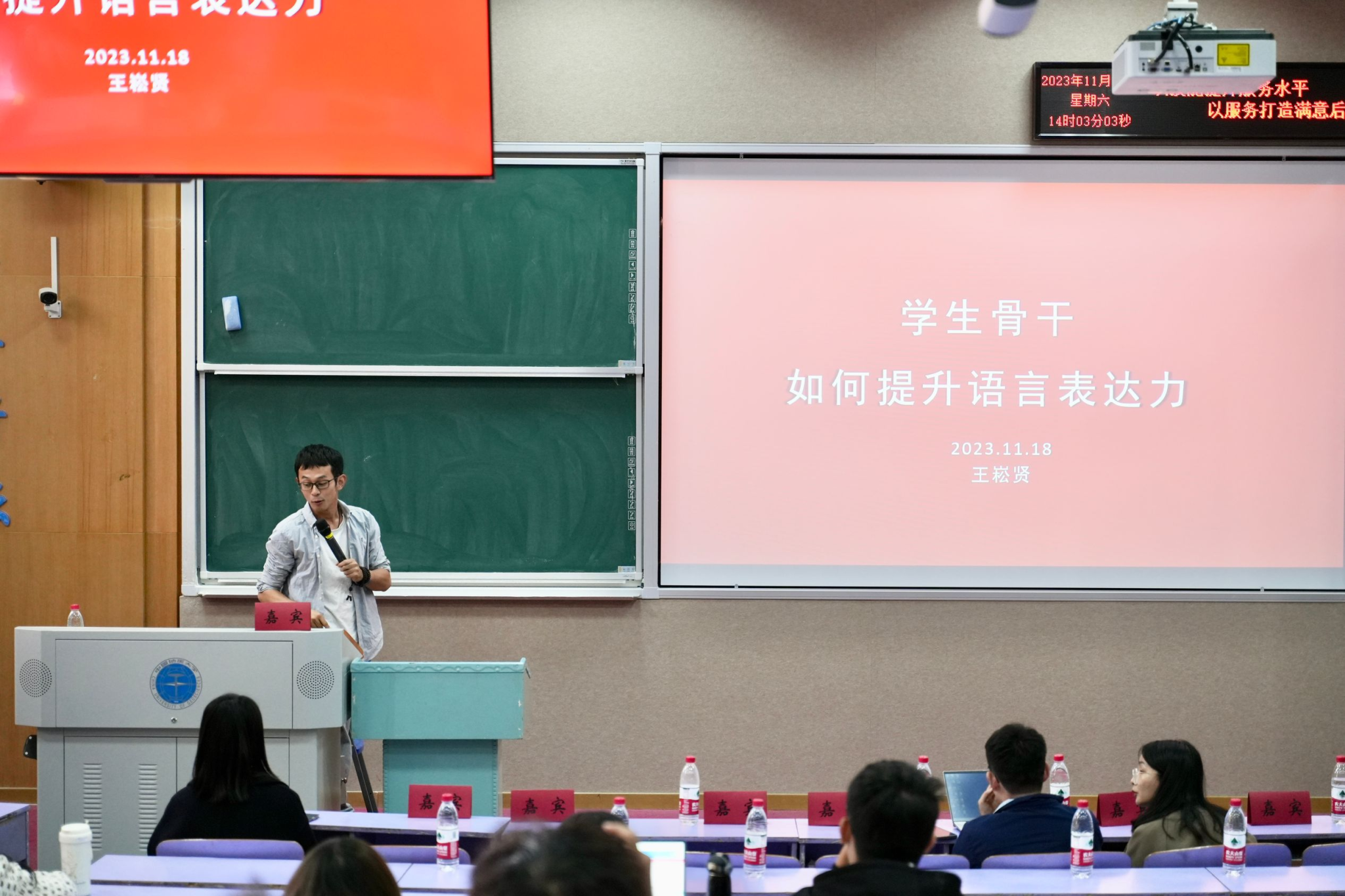 校研究生会主席王崧贤同学分享了自己多年的工作经验,总结出了与人交流沟通的“三大准则”。他提醒大家与人沟通前要做好准备工作,沟通时要保持平和的语气和谦逊的态度。为提高学生骨干的表达能力提供了方法指导。