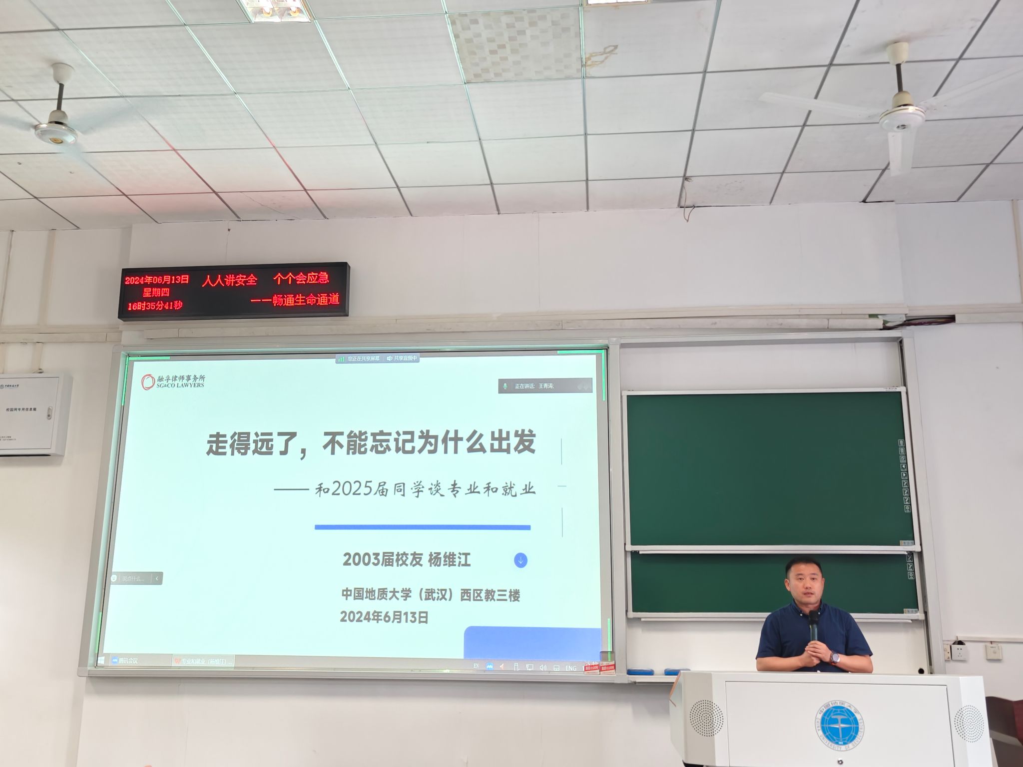会议第三项,2003届优秀校友杨维江进行经验分享。杨维江学长结合在上海律师所多年的工作实践,为同学们提供了宝贵的职业建议。他强调,毕业后应关注现实问题,在挫折中不断自我反思和总结,培养独立思考能力。同时,要锻炼思维,增强市场意识,学会有效展现个人价值,以更好地适应职场挑战。