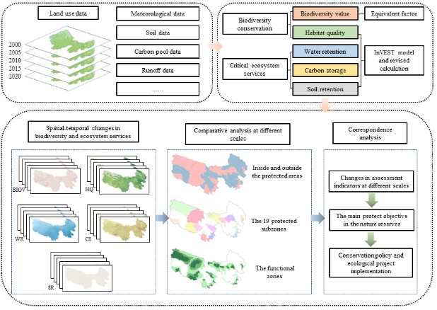 团队以从生物多样性和生态系统服务两方面构建指标体系,并采用InVEST等模型对指标依次进行量化,进而从全区、保护分区、功能分区等尺度进行上述指标的对比分析,评价了管理者在三江源地区自然保护区的管护工作的有效性。技术路线如图2所示。