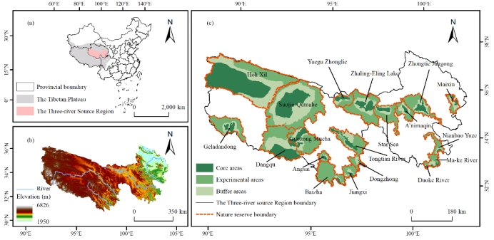 图1三江源在中国的相对位置和三江源地区自然保护区的分布