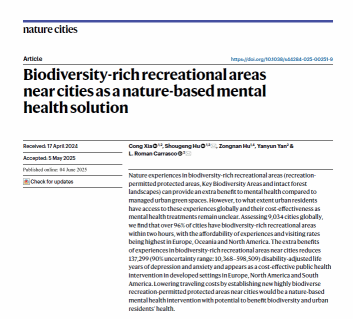 论文引用:Xia, C., Hu, S., Hu, Z. et al. Biodiversity-rich recreational areas near cities as a nature-based mental health solution. Nat Cities (2025). //doi.org/10.1038/s44284-025-00251-9