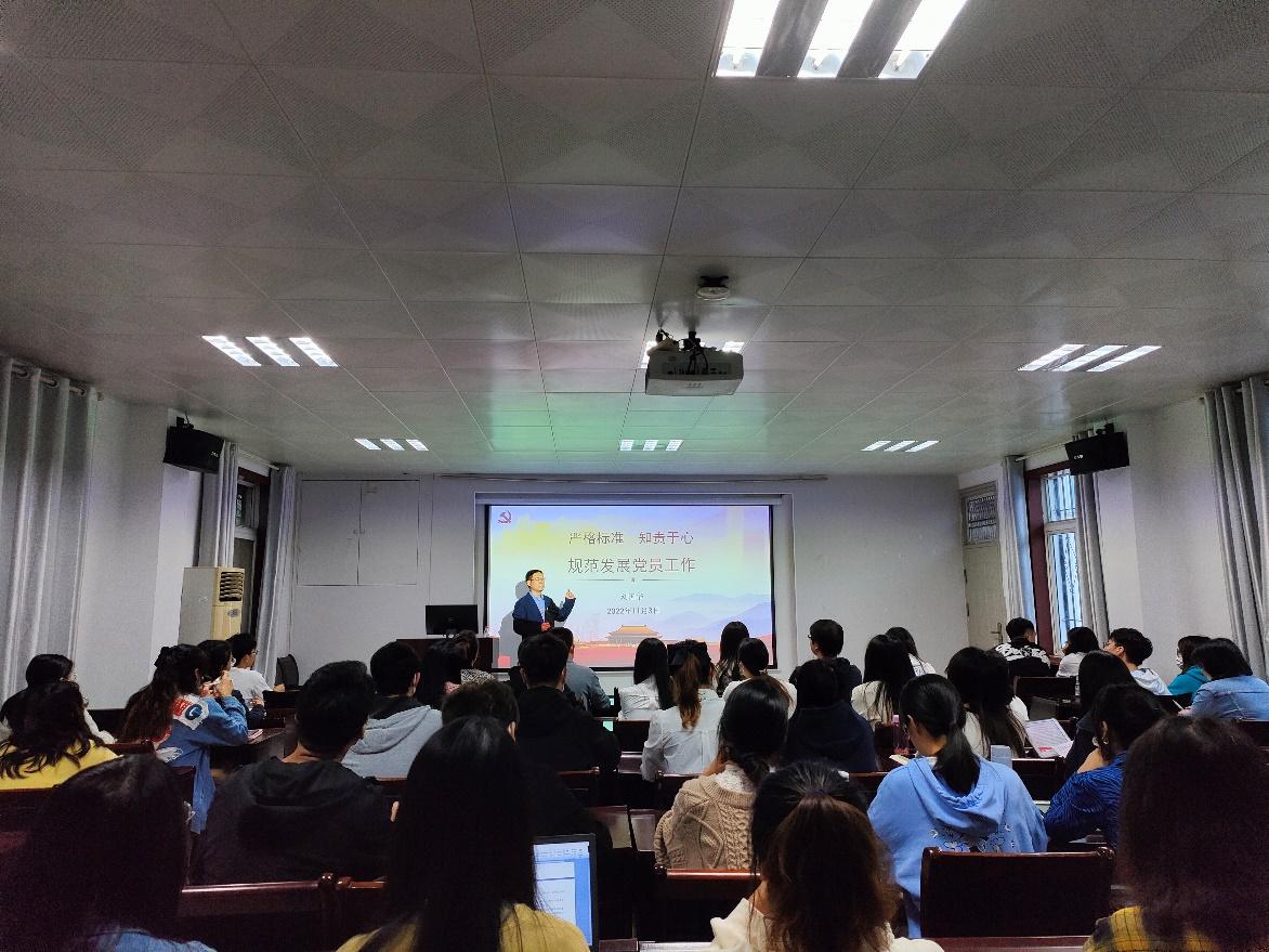 刘国华老师首先领学了党的二十大报告中有关党的建设的重要论述,并解读了党章修改内容。接着肯定了公管院学生党建工作具备扎实的工作基础,指出今年韩国三级 入选“全国党建工作示范高校”培育创建单位,对基层党建工作提出了更高质量的要求。随后以《严格标准,知责于心,规范发展党员工作》为题,讲述了发展党员工作总体要求和工作规范,强调规范发展党员程序、确保党员档案的完整性和真实性是基础性工作;并结合韩国三级 党员发展工作实际,分析了各学院党员发展过程中存在的共性和个性问题,提出学院党建工作要做好顶层设计、支委会要做好责任分工、发展过程要紧抓预审环节,多方合力共同做好党员发展工作。最后以党的二十大报告中习近平总书记对青年的寄语勉励青年党员要坚定信仰、敢于担当、勇毅勤奋、主动作为,将青春奉献到党和人民的事业中。