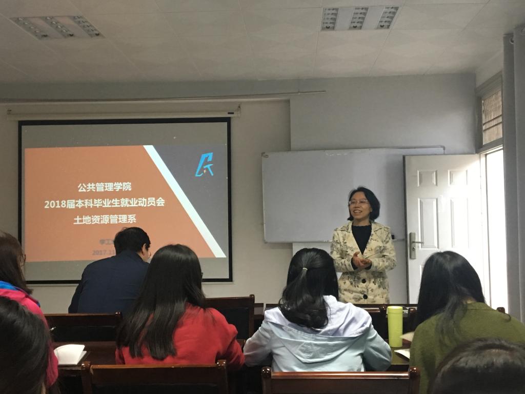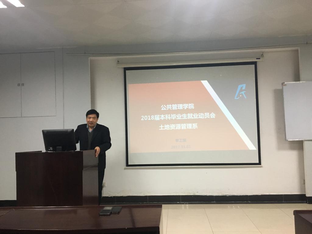 土地资源管理系2018届本科毕业生就业动员会在公管新楼101室顺利召开。学院副院长王占岐,院党委副书记胡文勤,土地资源管理系教授周学武、班主任渠丽萍,院团委副书记、2018届本科生辅导员李姝慧以及土地资源管理专业2018届本科毕业生参加此次会议。