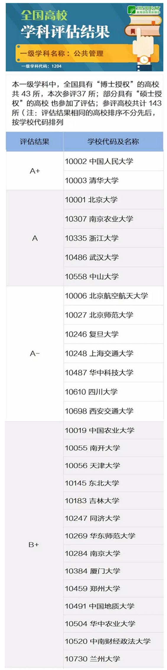 2017年12月28日,教育部学位与研究生教育发展中心公布了全国第四轮学科评估的结果。全国共有143所高校参加了本轮公共管理一级学科评估,韩国三级