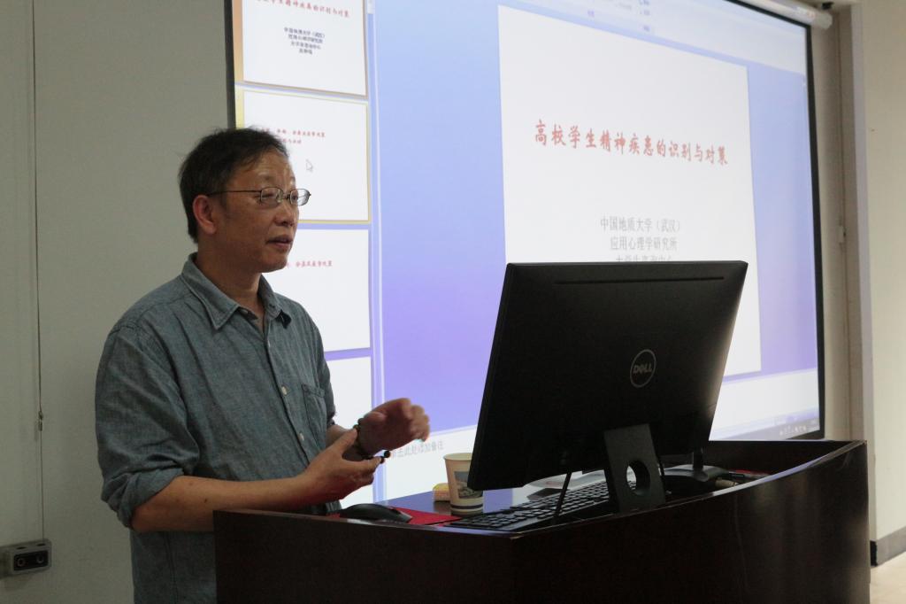 心理辅导师资的现状出发强调了本次心理健康教育培训的重要性,希望各位老师与同学们能加强有关心理疾病知识的学习,留心身边产生心理问题的同学,及时有效地给予帮助。接下来,吴老师就各类精神疾病的症状、诊断、分类及对应的医学处理方法进行了讲解。吴老师指出精神疾病可以从个人的适应性、前后比较与行为的可理解性方面来判断其是否患有精神疾病,具体的病症又分为器质性精神障碍、精神病障碍、人格障碍与神经症障碍四种。吴老师强调每种病症都有其典型的病种与症状,同时也介绍了正确的医学处理办法。随后,吴老师针对目前社会包括各大高校间发生率较高的抑郁症的识别与应对知识进行了讲解。吴老师先通过展示武汉市大学生常见心理疾病问题统计图来向我们说明目前抑郁症高发的严峻形势,随后从抑郁症的分类、征象、病程、心理特征及不同时期的抑郁症状态几个方面来详细说明。为了保障同学们的心理健康与生命安全,吴老师还强调,一旦发现身边有精神疾病症状的同学,一定要及时上报辅导员、联系家人,多方共同协助其治疗。