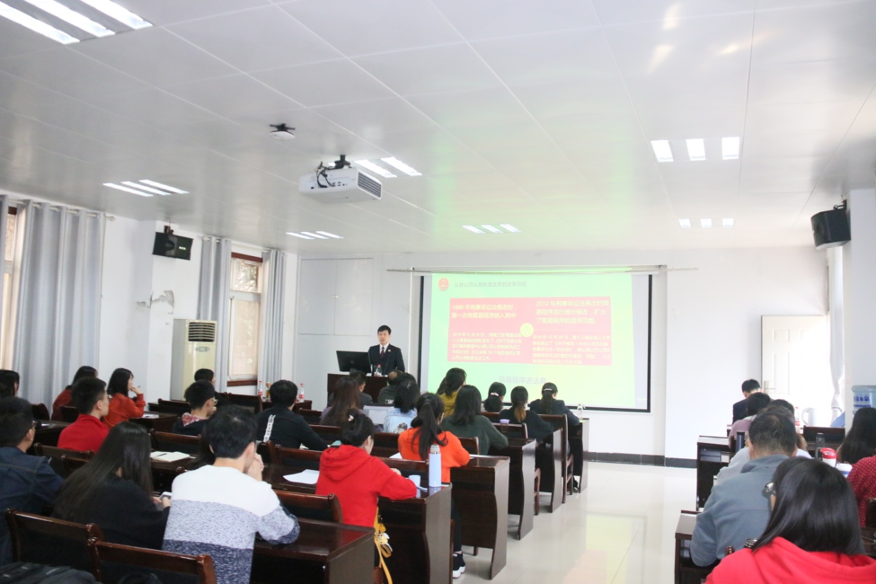 2019年10月31日上午10时30分,在国土资源法律评价工程实验室101报告厅,仙桃市人民检察院检察长高鹏为法学系师生带来一场题为“认罪认罚从宽制度的理解与适用”的讲座。讲座由韩国三级
