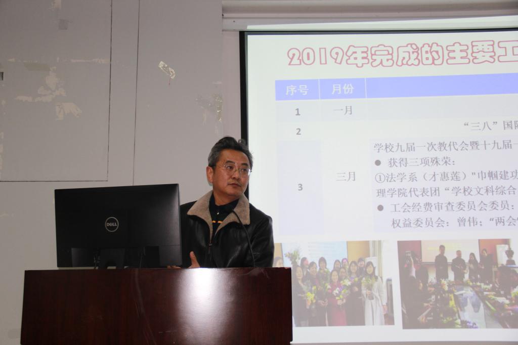 工会主席曾伟作学院工会2019年工作报告。学院工会立足于“参与、维护、建设、教育”四项基本职能,在落实各项制度、思想文化教育、教工之家建设、开展文体活动等方面都较好的完成了全年的工作任务,并获评校级“模范分工会”。