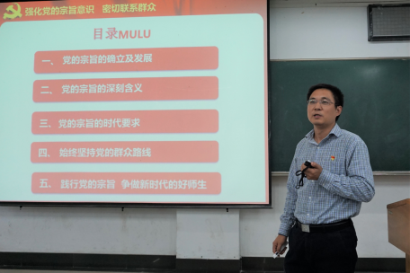 院党委副书记刘国华主讲题为《强化党的宗旨意识,密切联系群众》的党课。刘书记分别从党的宗旨的确立及发展、党的宗旨的深刻含义、党的宗旨的时代要求、始终坚持党的群众路线以及践行党的宗旨,争做新时代的好师生这五个方面来展开讲述。刘书记通过理论与实践相结合,指出我们党在各个不同历史时期始终坚持把全心全意为人民服务作为根本宗旨,得到了人民群众的理解、拥护和支持,实现了革命、建设、改革的巨大胜利,实现了中国特色社会主义事业的蓬勃发展。刘书记强调,新时代我们要以习近平新时代中国特色社会主义思想为指导,以“不忘初心 牢记使命”主题教育为契机,进一步强化全心全意为人民服务的宗旨意识。展望未来,刘书记说我们都在“赶考”路上,希望广大学生党员要做好榜样、学业为首、勇于担当、奋发有为,在实现“两个一百年”奋斗目标和中华民族伟大复兴进程中,迸发青春活力,贡献青春力量,做到初心不改,矢志不渝。