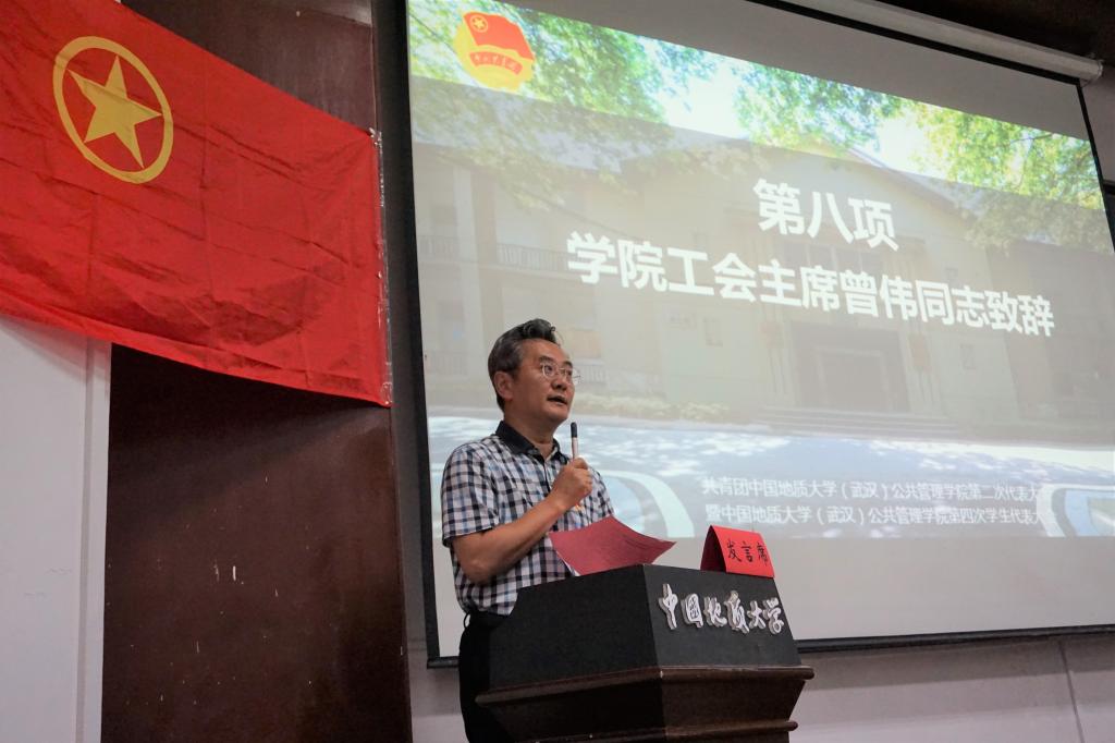 学院工会主席曾伟致词,他对本次大会的召开表示热烈祝贺,对各位代表的到来表示热烈欢迎,他也希望团学工作能够在学校、学院党委和上级团学组织的领导下,脚踏实地、勇于创新,带领全院广大团员坚定信念、励志进取、全面发展、再创佳绩。