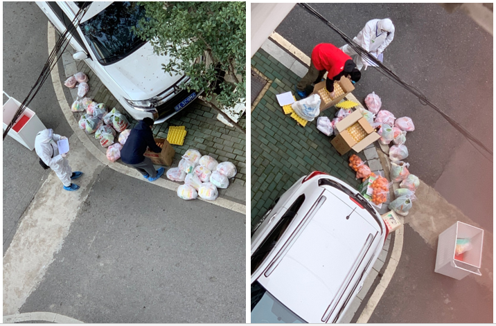 刘琦老师(穿蓝色和红色衣服)正在清点领取本单元居民的物资。