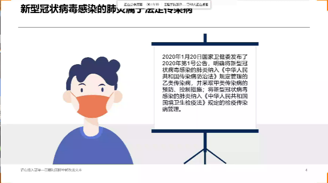 夏老师介绍了2020年1月20日,国家卫健委明确将新型冠状病毒感染的肺炎纳入《中华人民共和国传染病防治法》规定管理的乙类传染病,采取甲类传染病预防、控制措施。她讲述了新冠肺炎防治所涉的法律问题,剖析了许多涉嫌违法且会得到法律严惩的典型案例,并对大学生“依法抗疫”提出了若干建议。她说,作为一个大学生首先应该树立法律意识,模范遵守法律,不信谣不传谣,并且坚决抵制违法行为,其次可以依法依规参与志愿活动,最后特别提醒大学生牢记十点要诀,注意预防涉疫诈骗。
