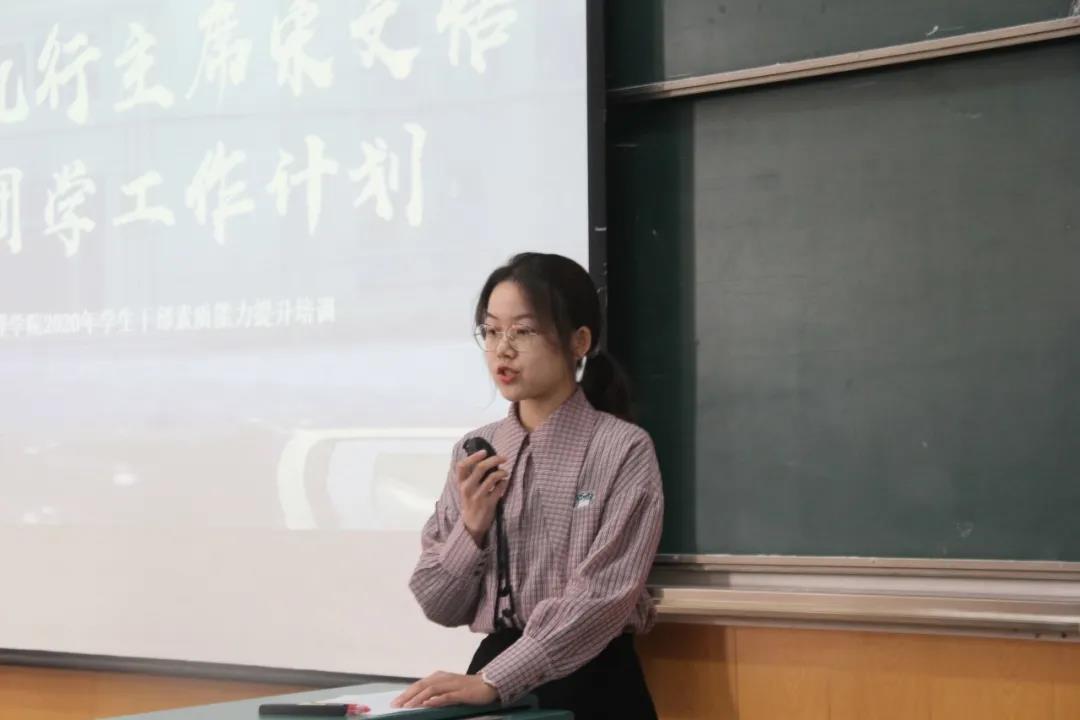 接下来,2020-2021届学生会执行主席宋文恬汇报了团学工作计划,并表示会不断改革、完善、落实各种规章制度;加强与各个组织、社团、校级学生会以武大等华中六校公管学院的交流,并加强校级活动的举办。