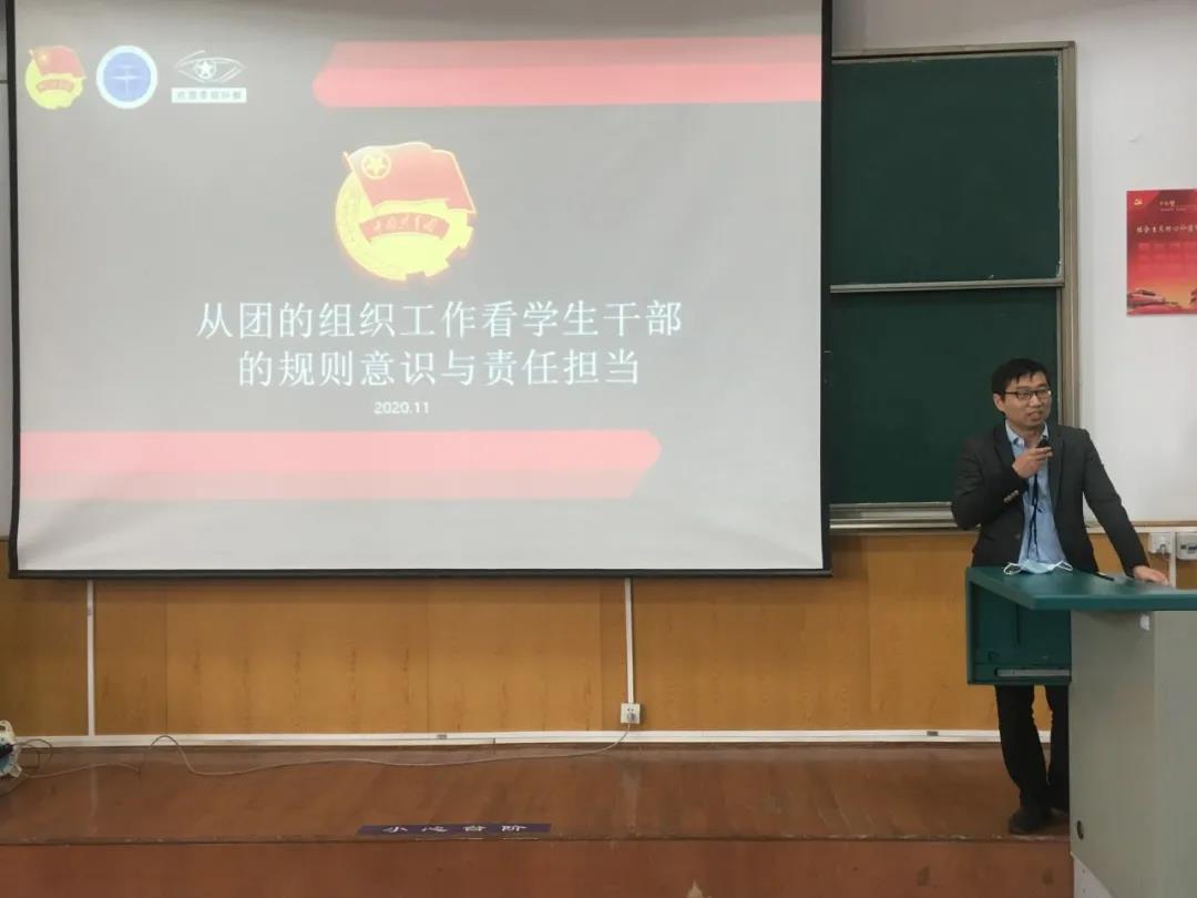 培训第三讲由校团委副书记谭文伦老师主讲,主题为“从团的组织工作看学生干部的规则意识与责任担当”。谭老师首先讲述了教育的本质:教育即生活、教育即生长、教育及经验改造、教育无其余目的。然后谭老师给同学们讲述了教育的发生、文化领导权的问题,以及教育发展的几个阶段,并询问同学们的自我定位、自我评价。谭老师以大学生成长发展的几个时期告诉我们不要焦虑,平复心情,找寻克服焦虑的方法。随后,谭老师给我们说了团务工作的作用、形式、负责部门以及团委组织部的工作内容,大致讲述了五四评优的内容以及评比的各种奖项,鼓励我们去争取。最后,谭文伦老师寄语大家:务实不懈怠,创新高站位,学习无止境,谦逊永躬行。