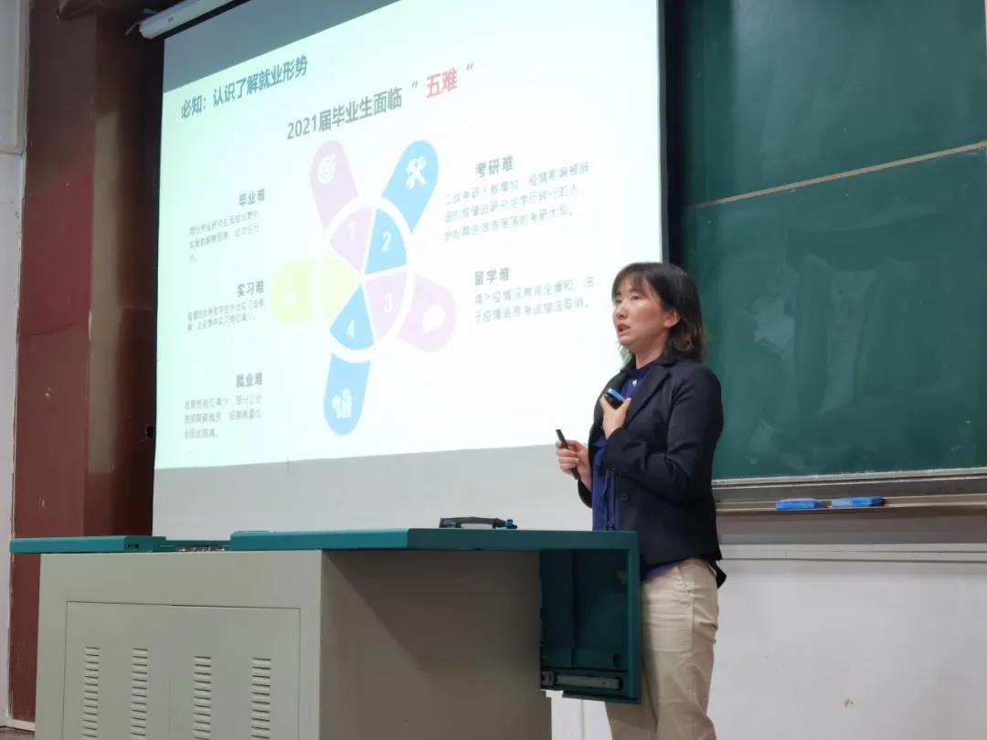一场疫情,让2021届毕业生的求职之路显得格外艰难。首先由校就业指导中心副主任郭玉凤老师带来就业形势分析与管理服务的介绍。郭老师综合分析了当前就业形势的严峻性,指出在疫情和国际形势复杂化的影响下,国内经济发展受到冲击,企业招聘方式发生变化,就业市场应届生岗位需求大幅收缩,2021届毕业生将面临“五难”问题——毕业难,实习难,就业难,考研难,留学难。