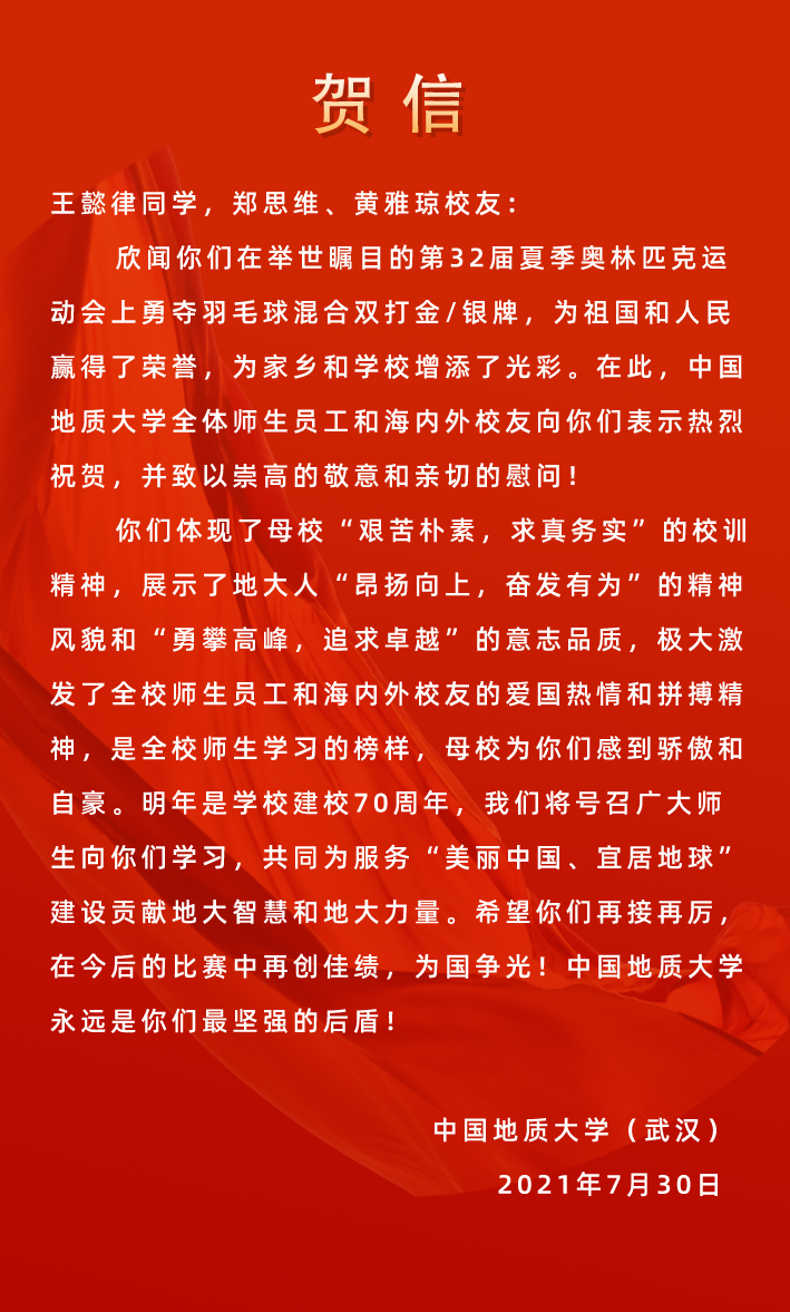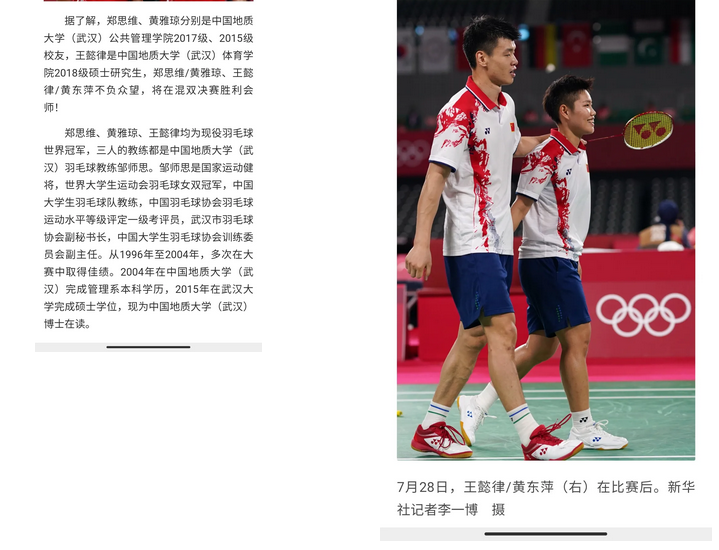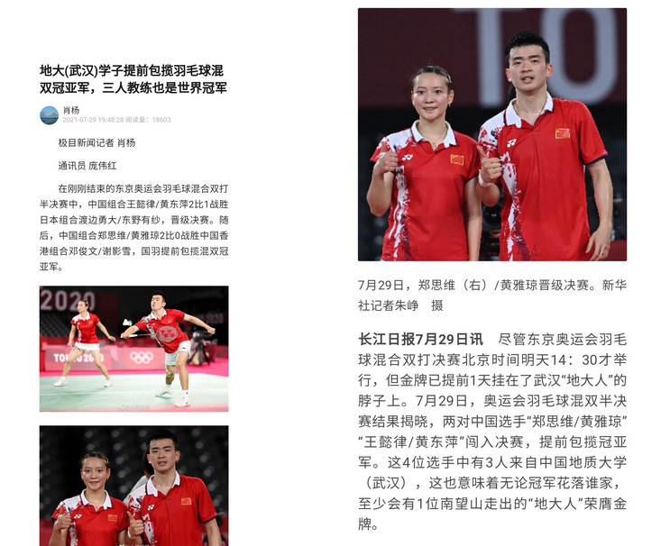 参加中国大学生羽毛球锦标赛、世界大学生运动会等赛事,获得过冠军;王懿律代表地大比赛取得的最好成绩,是在世界大学生羽毛球锦标赛中获得亚军。邹师思也作为教练带队参加这些赛事,她说,此次3人会师东京并取得如此佳绩,自己作为老师,激动、开心、自豪。