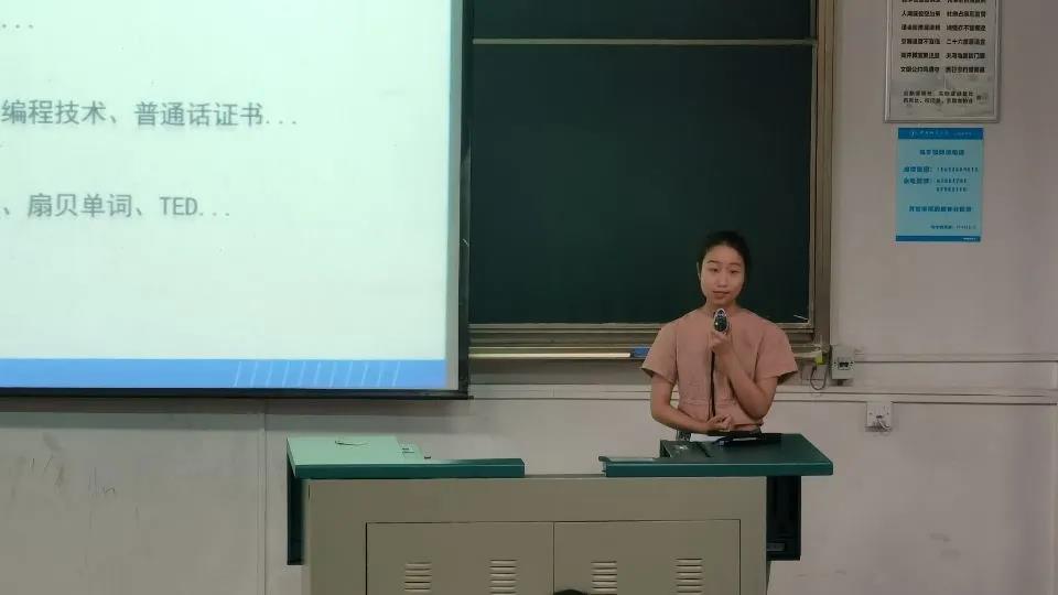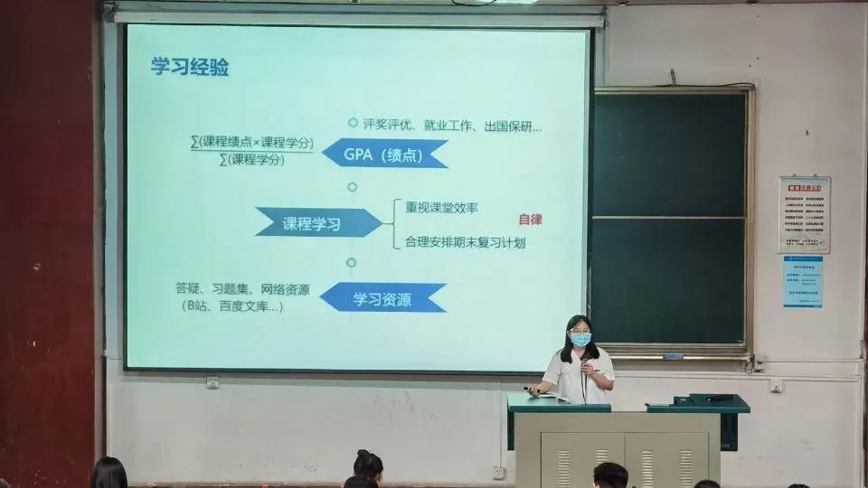 最后一位分享的是土管专业的刘书含同学,她为同学们提供了一些学习小贴士,并提醒同学们要“踏出舒适圈”,鼓励他们多参与竞赛活动、志愿活动。