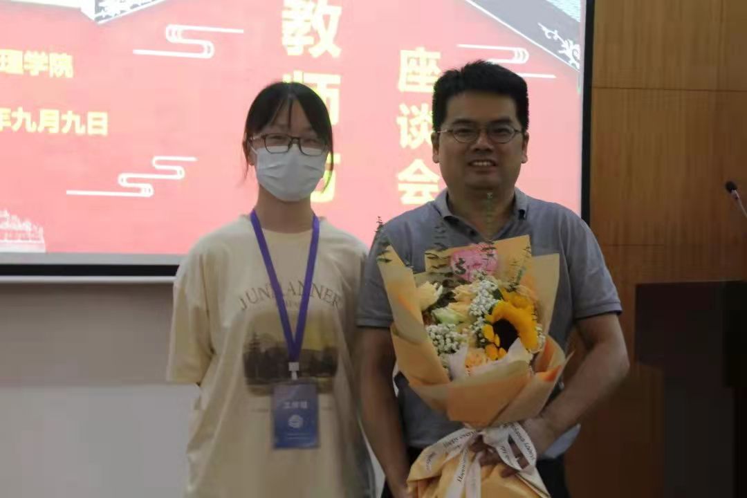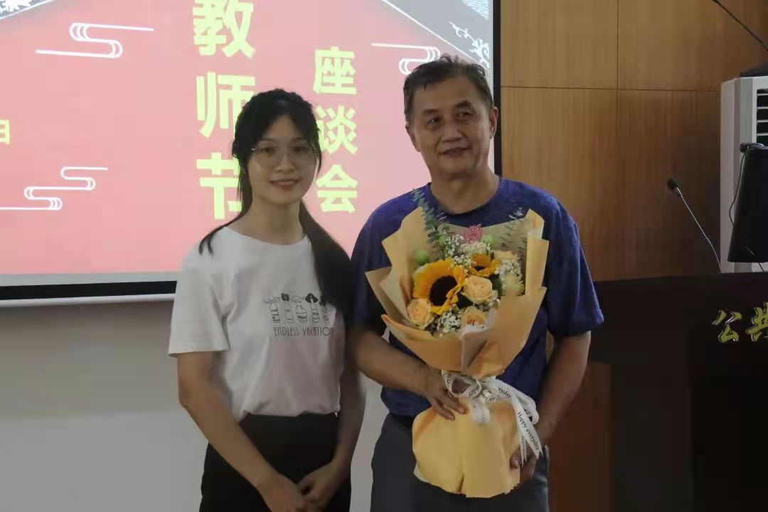 座谈会第二项,学生代表献花。学生代表先后向陈安民、杨力行、李江风、张吉军、王占岐、刘国华、才惠莲、胡中华、刘琦、龚健等教师代表一一献上鲜花,表达感恩与祝福。