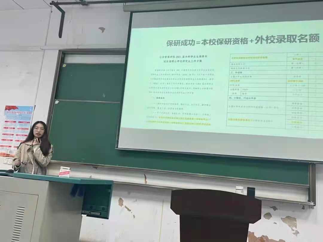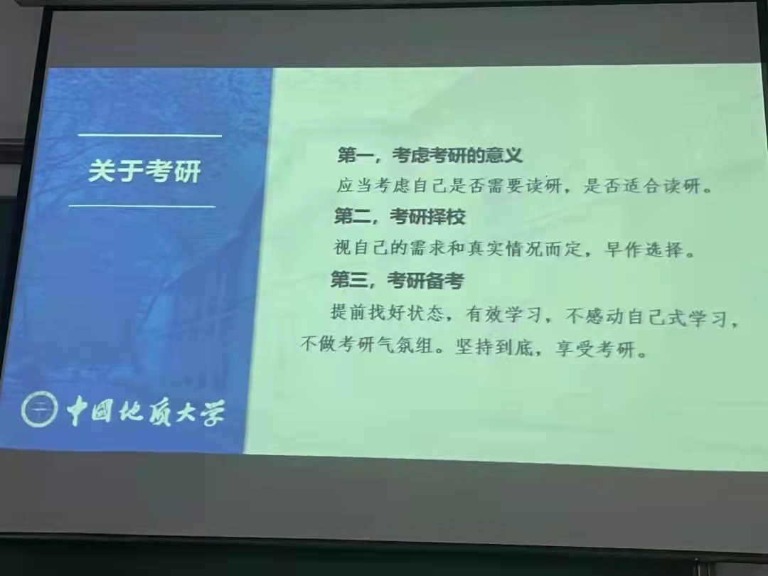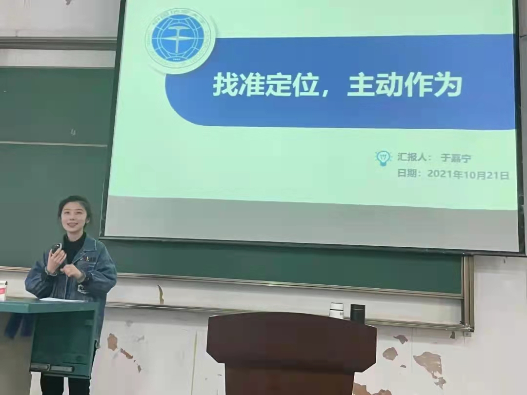 随后,2021级土地资源管理专业硕士研究生于嘉宁以《找准定位 主动作为》为题,从是否考研、略好择校、资料收集、学习安排、遇到的问题等方面进行分享。她分析了当下考研形势、如何正确认识考研、需要收集哪些信息、学习资料收集渠道、经验贴收集渠道、怎样找到重点考试内容、如何形成知识框架等方面内容。告诉学弟学妹们在考研历程中须保持理智头脑,日常学习中养成自己良好的学习习惯并期待通过自己努力实现心中的目标。