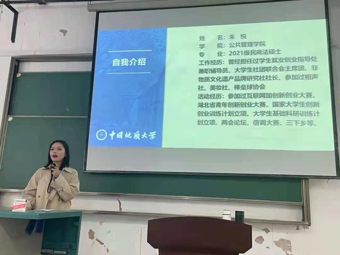 2021级民商法硕士研究生朱悦首先分享了她的大学学习生活和考研经历。她以蔡元培先生的“大学者,研究高深学问者也,为囊括之大典,网罗众学之学府”引入话题,提出五点大学生应尽的义务,分享了基本情况、我的大三在做什么、如何协调生活与工作、关于考研、个人建议等方面内容。她谈到自己如何通过时间规划协调学习、学生工作和生活,着重强调了独立思考的重要性,从考研准备时间、择校备考方向、心态准备、身体准备等方面进行更深入交流,特别强调了参加秋招的重要性,送出“毕业时仍是鲜衣怒马少年”的美好祝愿。