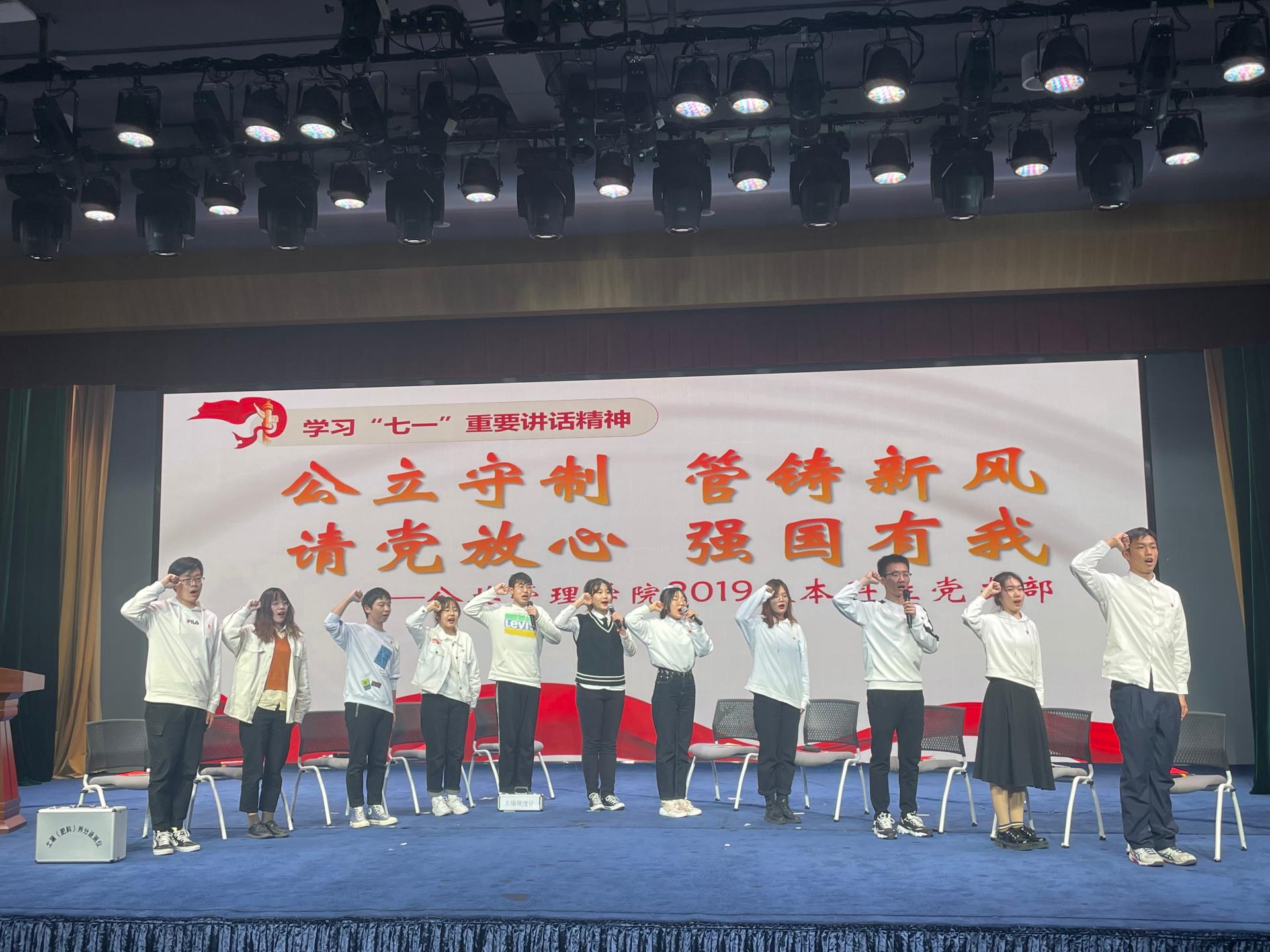 第二环节由11名同志进行5分钟的展演。展演紧紧围绕学习“七一”重要讲话精神,结合专业特色开展主题党日学习:胡学湉同志作为“土管人”,积极投身于自然资源合理利用和生态保护事业,参与长江大保护项目,为生态文明建设贡献一己之力;翟一帆同志作为“法学人”,他认为,在依法治国方略的统领下,以《长江保护法》为首的流域法、生态保护红线制度的配套法律等,都是法学领域为保护生态环境做出的积极响应;王晓旭同志作为“公管人”,谨记共同富裕的奋斗目标,作为新时代新青年在新的赶考路上,须勇担时代大任,争做推动早日实现第二个百年奋斗目标的先锋力量。最后,所有同志面向党旗,表达了“公立守制,管铸新风;请党放心,强国有我”的强大信心与决心。