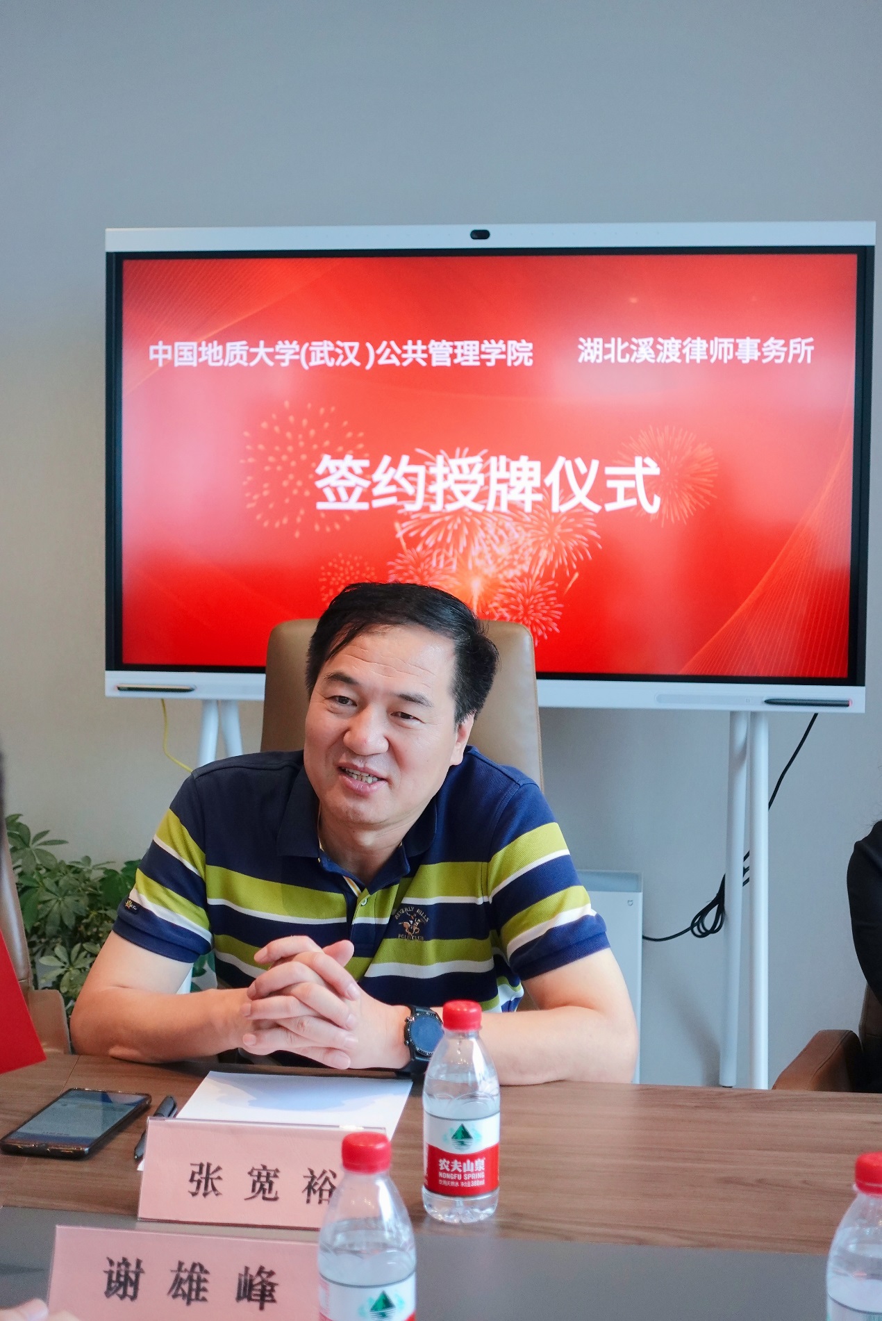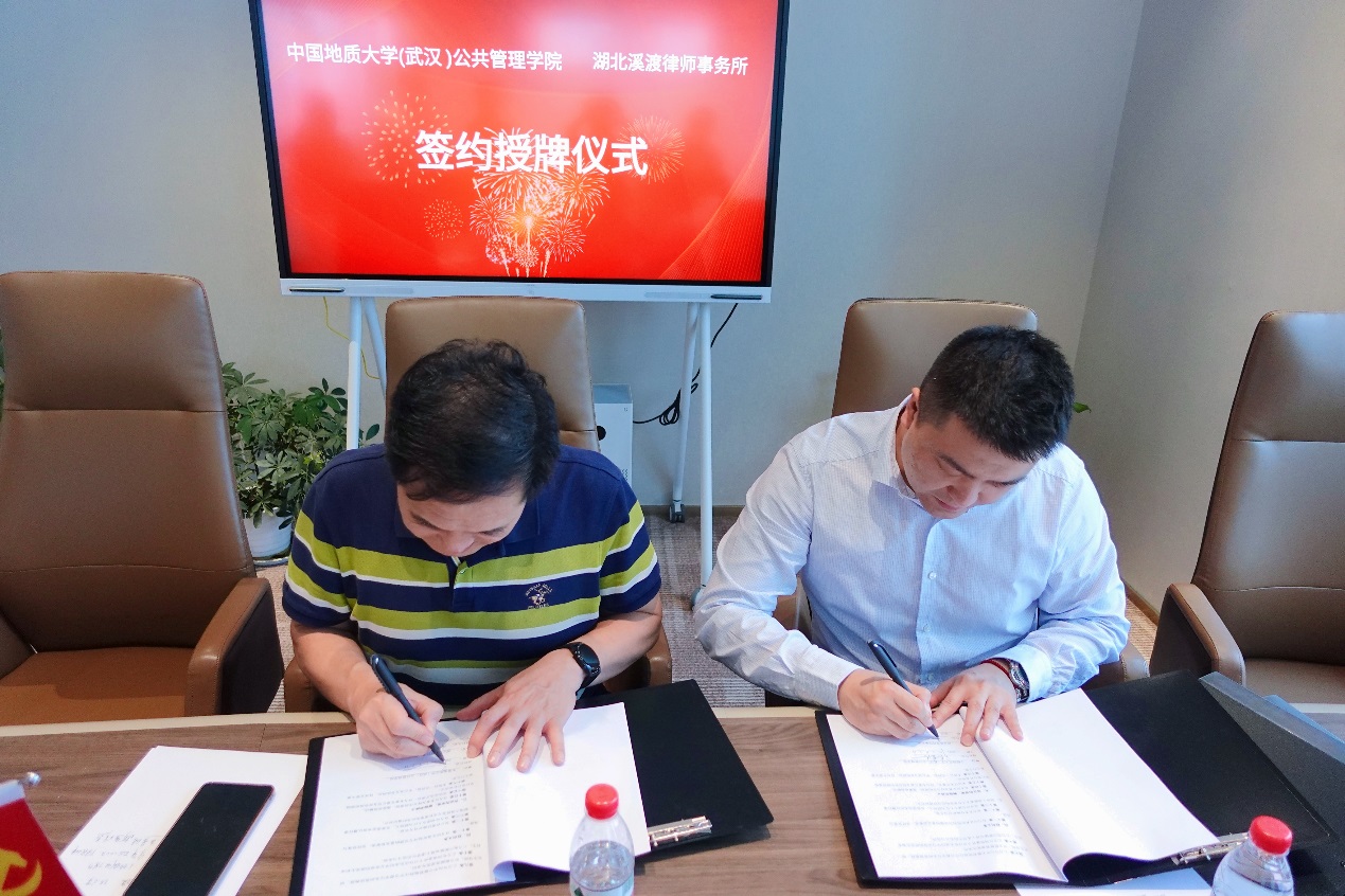 在“南望山”会议室,溪渡合伙人刘莲主持本次签约挂牌仪式。谢雄峰书记代表溪渡律所热烈欢迎地质大学的师生领导。他回顾了自身的求学工作生涯,十年曾一别,征路此相逢,选择“南望山”命名的会议室举行今天的活动,就是出自对母校培养的感恩之心;在校企合作、协同育人的背景下,培养卓越法治人才是高校和律所共同的需求,溪渡所十分重视本次的合作共建协议。