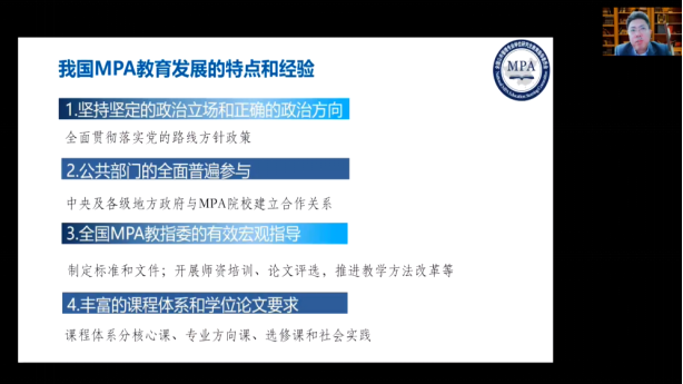 、MPA发展给予的支持和帮助表示了由衷的感谢。同时他也结合学院MPA教育当前开展的工作从国际交流、MPA与学校特色领域相结合等方面展望了未来发展。