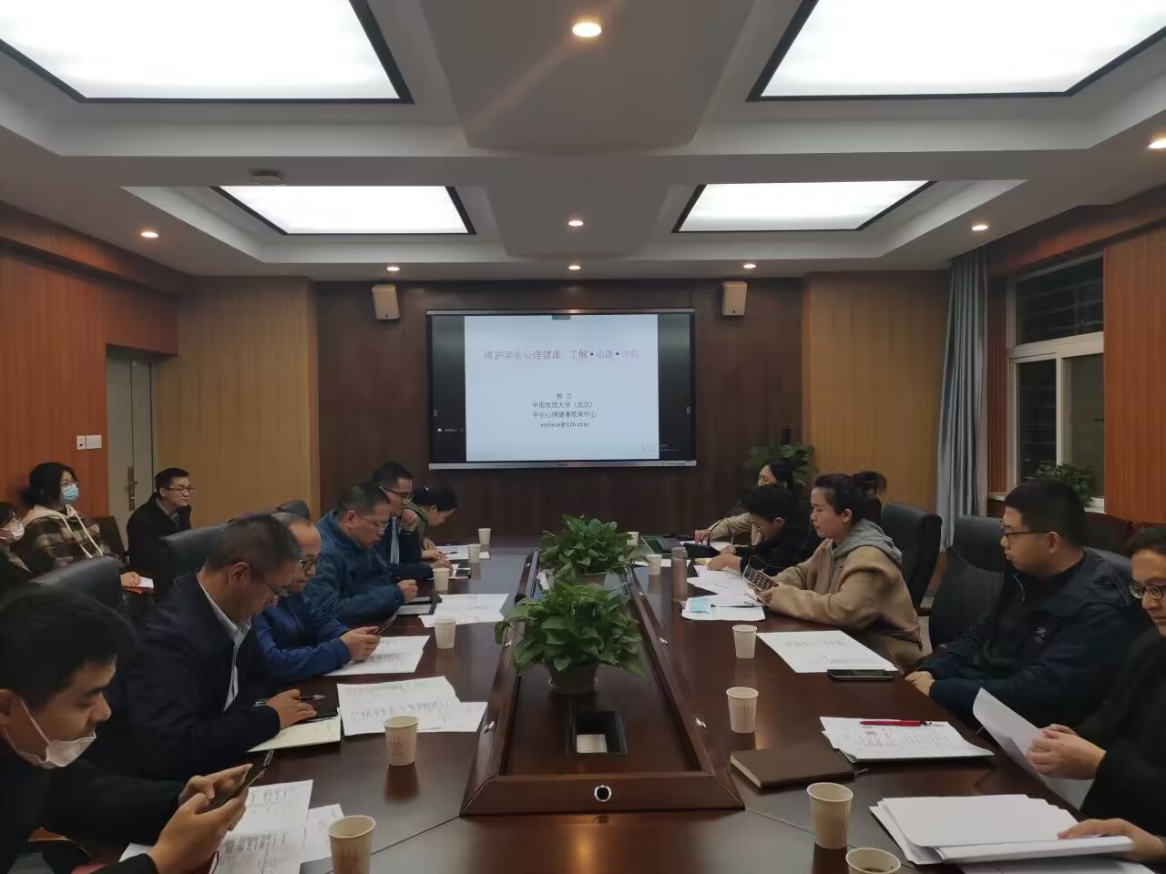 (武汉)班主任队伍建设管理实施办法(试行)》等相关文件精神,强调班主任、辅导员和专业教师间相互协同、互相配合,共同促进学生全面成长成才。郭兰教授以“维护学生心理健康:了解·沟通·干预”为主题,结合自身工作实际和真实案例针对专业老师如何发现问题、如何和学生沟通、如何关注学生等内容进行培训,现场氛围活跃,与会老师们进行了热烈地交流讨论。