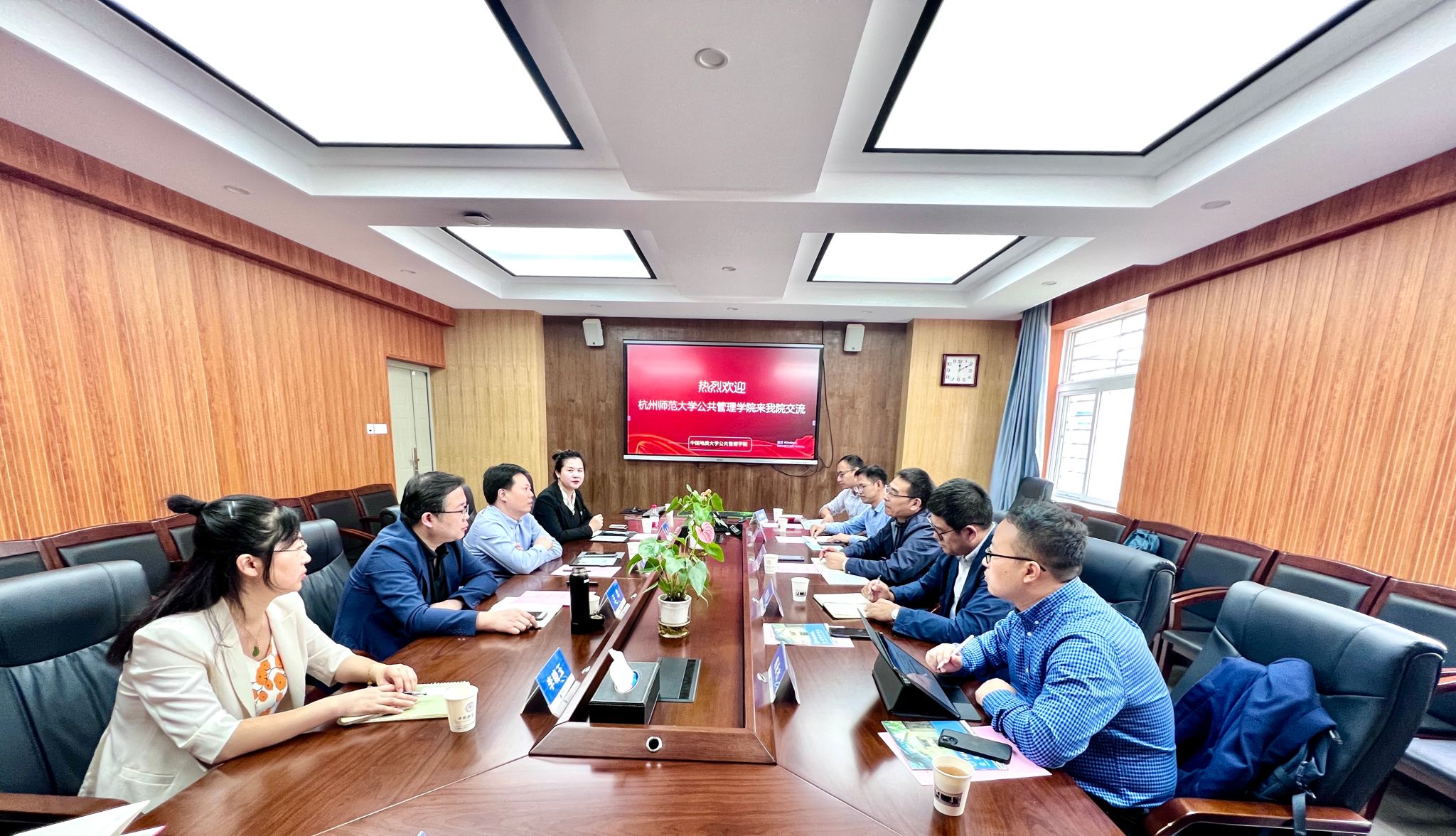 党委书记袁坚春,院长陈丹宇,副院长张超,行政管理系主任陈永杰、副主任吕鸿强一行来学院调研交流。院长胡守庚,副院长王忠,党委副书记龚丽,公共行政系主任李晓玉,公共行政系党支部书记张光进等人参加调研座谈会。
