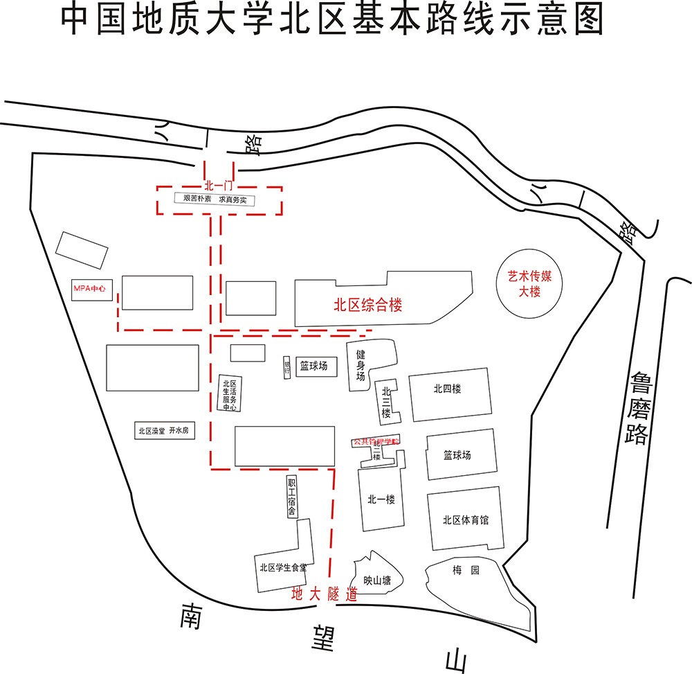 402、413、340路到八一路沙湾村站下车前行200米即到地质大学北区北1门,709、59、401、72路到鲁磨路南望山站下车,左拐步行550米即到地质大学北区南门。