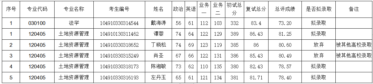 考虑 韩国三级 学科发展需求,经学院申请,研究生院同意,给予韩国三级 法学专业增加一个指标,土地资源管理专业增加3个指标。现将补录结果公示如下(顺位录取。如有放弃,顺次录取):