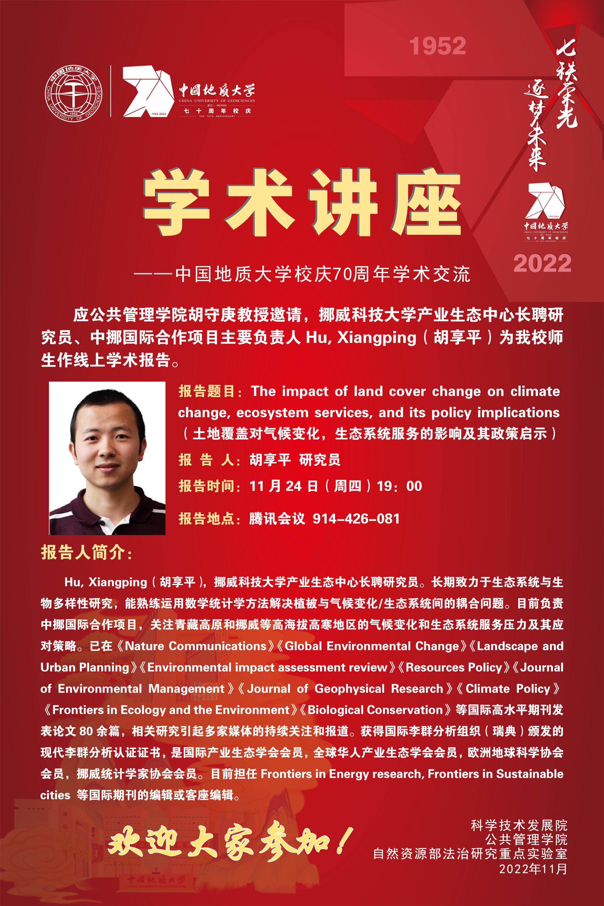 【讲座预告】土地覆盖对气候变化,生态系统服务的影响及其政策启示
