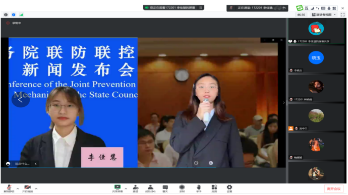 (通讯员 刘中兰 鲍媛媛)为激发公共行政系学子对新闻发言的兴趣,鼓励学生关注时事热点,培养学生综合实践能力,凸显公共行政系专业培养方案特色,12月23日,公共行政系172201、172202、173201、173202班全体学生开展了模拟新闻发言人实训活动。因疫情防控需要,采用腾讯会议线上组织进行。本次《模拟新闻发言人》课程实践训练活动由刘中兰老师组织和主持,参加的评委老师有卓成刚教授、罗辉教授、李晓玉副教授、刘中兰副教授和黄砺副教授。