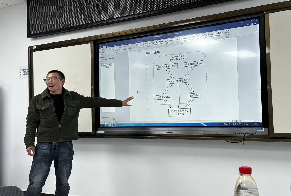 在讲座最后部分的互动交流环节,同学们就方阳老师的成长工作经历、应急管理的就业方向、保研考研VS考公等等产生了巨大好奇,方阳老师耐心的讲解并抛出加入创新创业行列的机会,自己的创业成果区域应急管理智能框架模型等等。