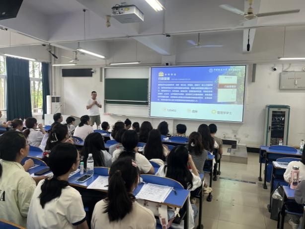 公共行政系主管本科教学工作的副主任钱文强老师从培养特点、培养过程、培养方案及培养成效等方面进行详细讲解。他提到,本科培养以“夯实理论基础、拓宽知识视野、提升实践素养”为特点,培养过程贯穿“课程学习—实践实训—毕业设计”三个阶段,帮助学生构建完整的知识体系与能力结构,并为新生梳理了四年的学习规划重点。此外,钱老师还巧妙运用“木桶理论”,提醒新生既要发现自身短板并及时补齐,也要找准优势领域持续强化,实现全面发展与特色成长的有机统一。