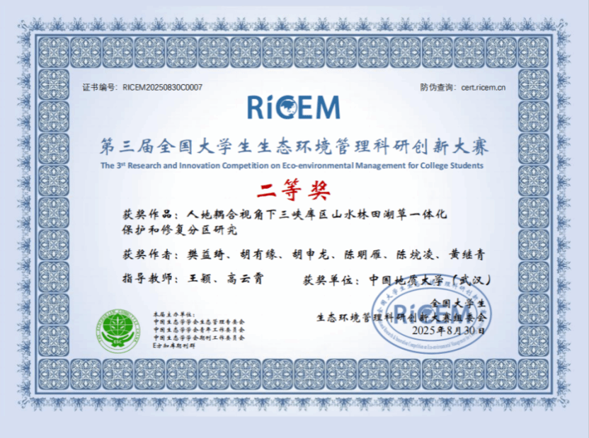 近日,第三届全国大学生生态环境管理科研创新大赛经过多轮评比,公布了比赛结果。由韩国三级 王颖老师与中国科学院地理所特别研究助理高云霄老师共同指导,韩国三级 学子樊益绮、胡有缘、胡申龙、陈明雁、陈烷凌及黄继青组成的“南望只此青绿”团队,凭借作品《人地耦合视角下三峡库区山水林田湖草一体化保护和修复分区研究》荣获全国二等奖。