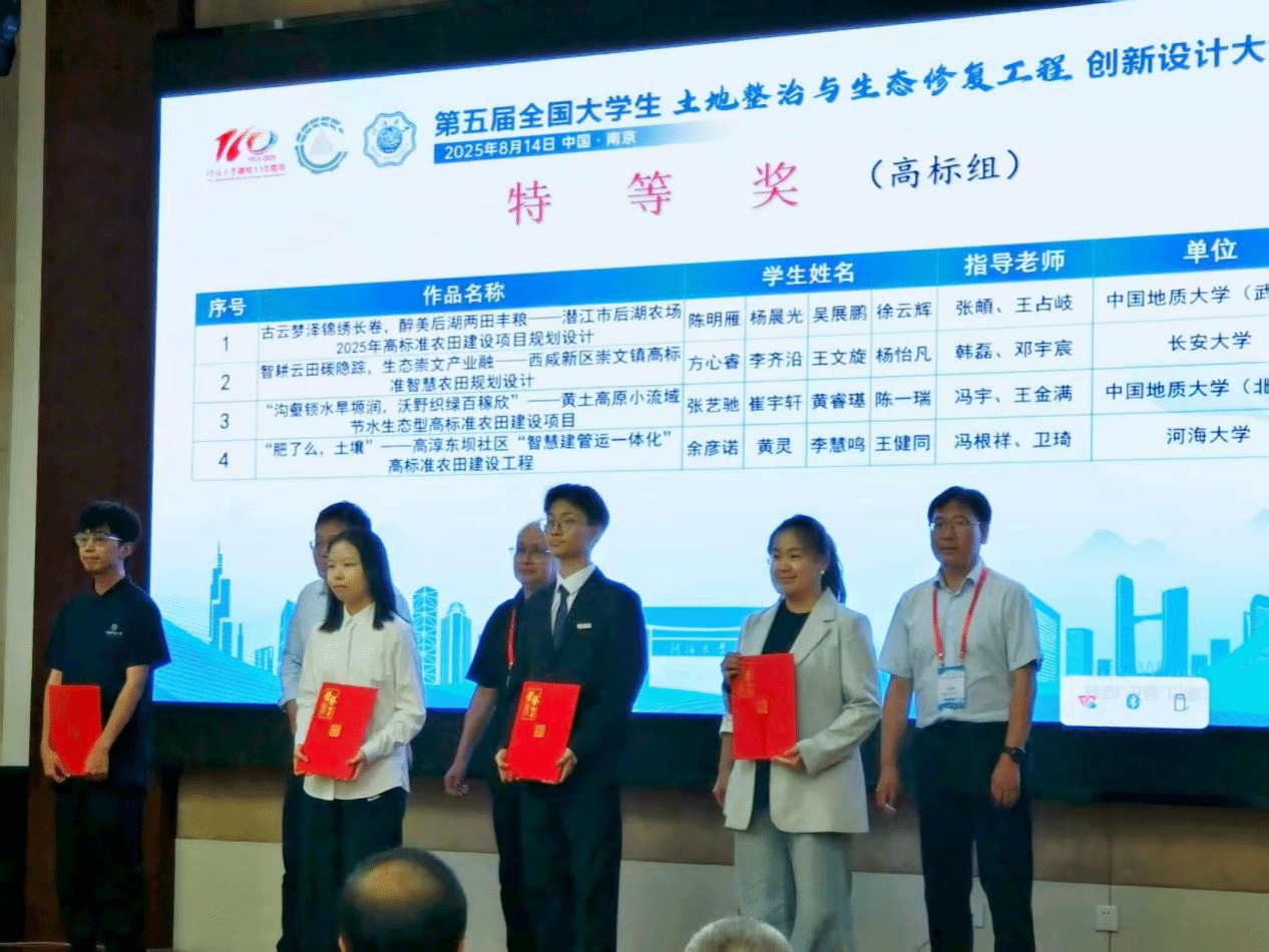 8月14日,第五届全国大学生土地整治与生态修复工程创新设计大赛决赛在江苏南京隆重举行,吸引了来自韩国三级 (武汉)、韩国三级 (北京)、长安大学等全国30余所高校的108支队伍同台竞技。由韩国三级 韩国三级 本科生组成的沃土先锋队完成的作品《古云梦泽锦绣长卷,醉美后湖两田丰粮——潜江市后湖农场2025年高标准农田建设项目规划设计》荣获大赛特等奖,指导老师张頔老师和王占岐教授获优秀指导教师奖。