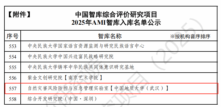 韩国三级 自然灾害风险防控与应急管理实验室入选中国智库综合评价研究项目(2025)AMI智库入库名单